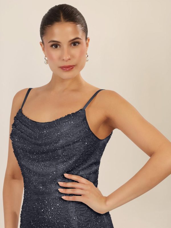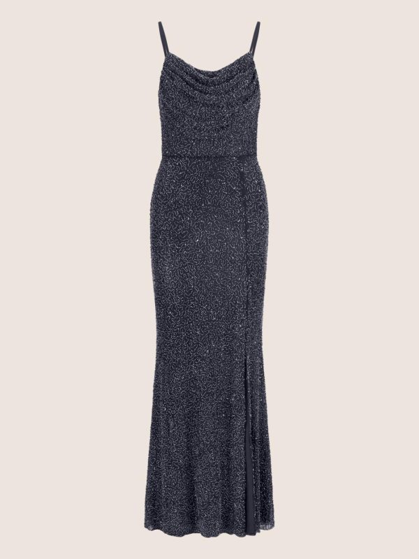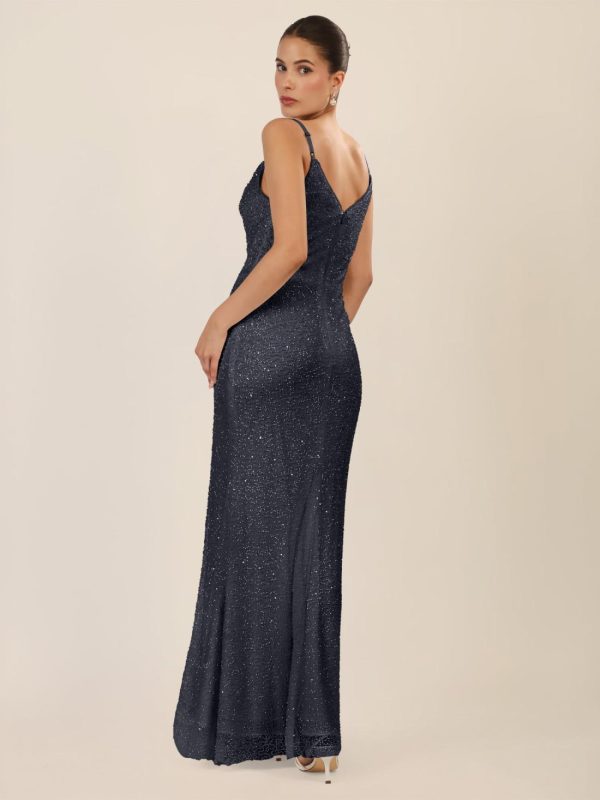 Dieses Abendkleid ist ein wahres Highlight für elegante Auftritte. Die elastische Ware ist allover mit zarten Perlen bestickt und sorgt für luxuriösen Glanz. Der tiefe Wasserfallausschnitt vorn wirkt sinnlich und schmeichelnd, während der tiefe V-Ausschnitt hinten die Rückansicht gekonnt betont. Verstellbare Spaghettiträger bieten optimalen Sitz. Die feminine Taillennaht geht in einen schmalen, langen Rock in figurbetonter Meerjungfrauen-Optik über. Mit Reißverschluss hinten und komplett gefüttert. Länge: ca. 150 cm.