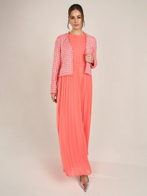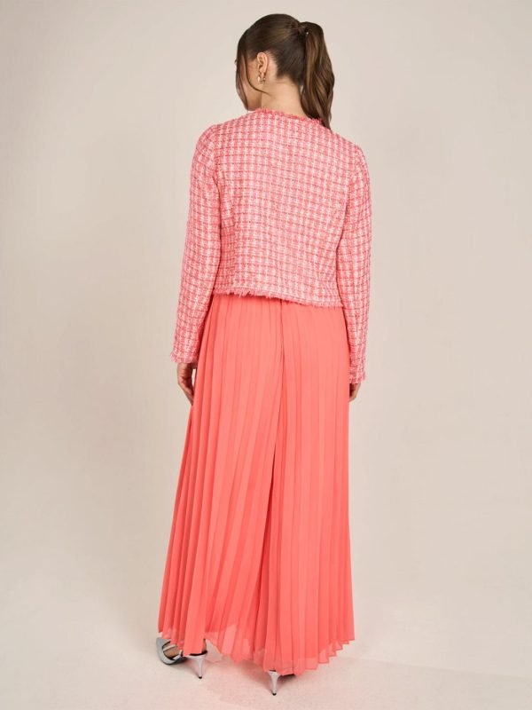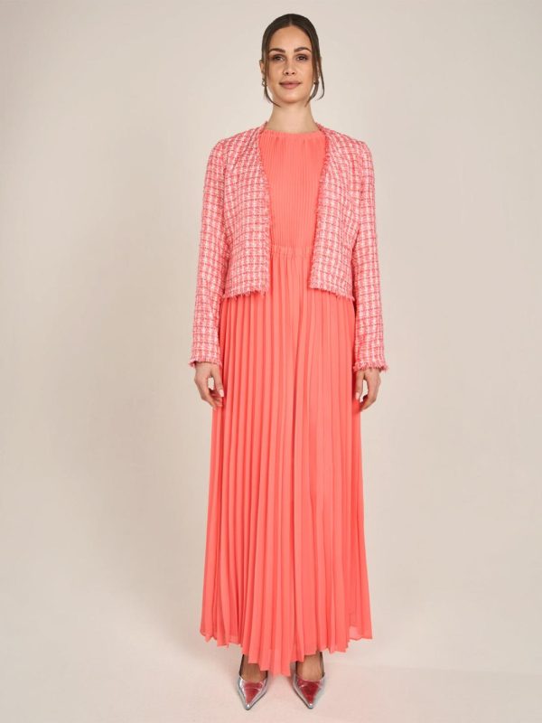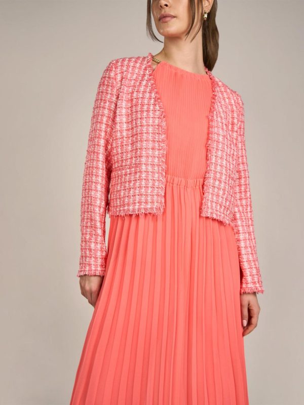 Dieser Boucleblazer bietet klassische Eleganz und modernen Stil in einem. Mit seinem offenen Design und den fein strukturierten Fransenabschlüssen setzt er dezente Akzente. Die gerade geschnittene Silhouette und die langen Ärmel machen diesen Blazer zu einem vielseitigen Begleiter für besondere Anlässe oder den Alltag. Die durchgehend gewebte Struktur verleiht ihm einen einzigartigen, hochwertigen Look. Kombinieren Sie ihn mit passenden Hosen oder Röcken für ein stimmiges Outfit.