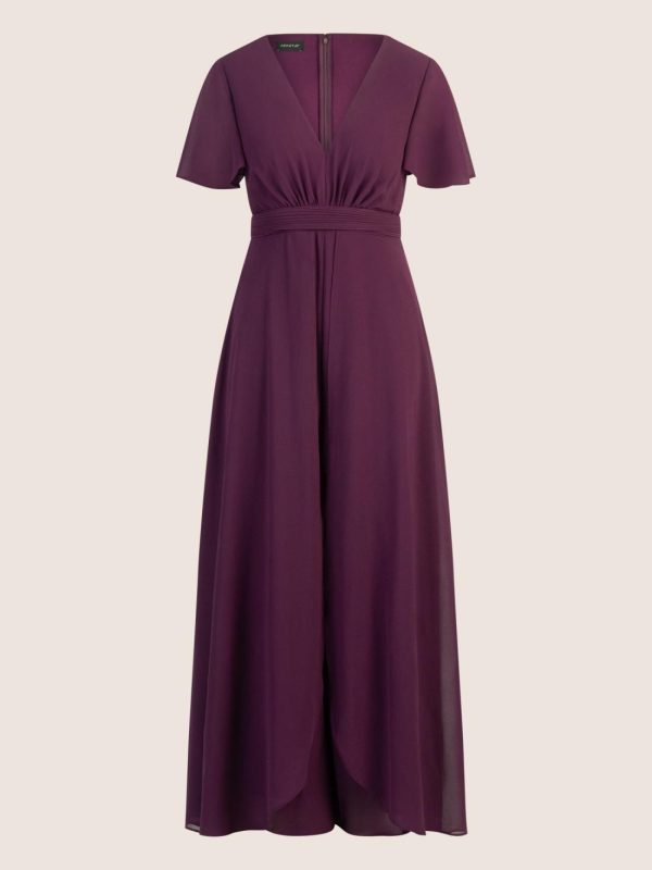 Dieser traumhafte Overall aus fließendem Chiffon verbindet die Eleganz eines Abendkleides mit der Coolness eines Jumpsuits. Das Oberteil überrascht mit einem tiefen V-Ausschnitt und feinen Raffungen an der Taille, während eingearbeitete Brustpads für perfekten Halt sorgen. Der Rücken zeigt sich mit einem femininen, runden Ausschnitt. Kurze Volantärmel verleihen dem Design eine verspielte Leichtigkeit. Ein besonderes Highlight ist der in Falten gelegte, weite Rock, der wie ein Cape über der Hose fällt und sich vorne bis zur Taille dramatisch öffnet – so entsteht bei jeder Bewegung ein aufregendes Spiel zwischen Rock und Hosenpart. Die weit geschnittene Hose mit vertieftem Schritt unterstreicht den lässigen Glamour-Look. Ein verdeckter Reißverschluss in der hinteren Mitte sorgt für ein einfaches Ankleiden. Ein stilvoller Auftritt mit Wow-Effekt ist garantiert.