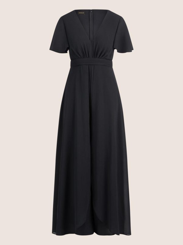 Dieser traumhafte Overall aus fließendem Chiffon verbindet die Eleganz eines Abendkleides mit der Coolness eines Jumpsuits. Das Oberteil überrascht mit einem tiefen V-Ausschnitt und feinen Raffungen an der Taille, während eingearbeitete Brustpads für perfekten Halt sorgen. Der Rücken zeigt sich mit einem femininen, runden Ausschnitt. Kurze Volantärmel verleihen dem Design eine verspielte Leichtigkeit. Ein besonderes Highlight ist der in Falten gelegte, weite Rock, der wie ein Cape über der Hose fällt und sich vorne bis zur Taille dramatisch öffnet – so entsteht bei jeder Bewegung ein aufregendes Spiel zwischen Rock und Hosenpart. Die weit geschnittene Hose mit vertieftem Schritt unterstreicht den lässigen Glamour-Look. Ein verdeckter Reißverschluss in der hinteren Mitte sorgt für ein einfaches Ankleiden. Ein stilvoller Auftritt mit Wow-Effekt ist garantiert.