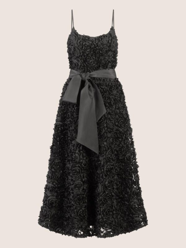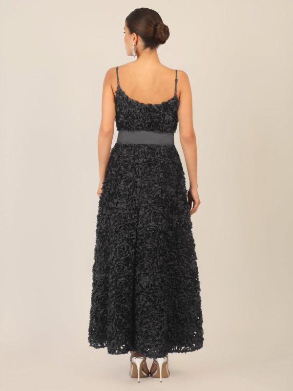 Dieses knöchellange Cocktailkleid aus feinem Mesh bezaubert mit einer spektakulären Allover-Verzierung aus voluminösen Laser-Cut-Rosetten, die dem Design eine exquisite 3D-Optik verleihen. Die tiefen, runden Ausschnitte vorne und hinten bringen subtile Sinnlichkeit ins Spiel, während verstellbare Spaghettiträger für individuellen Tragekomfort sorgen. Die femininen Teilungsnähte und die Taillennaht betonen die Figur, bevor der ausgestellte Rock in Glockenform schwungvoll in Bewegung gerät. Praktische seitliche Eingriffstaschen und ein seitlicher Reißverschluss ergänzen das Design ebenso wie der separate, breite Bindegürtel, der für zusätzliche Raffinesse sorgt. Vollständig gefüttert garantiert das Kleid ein angenehmes Tragegefühl – ideal für elegante Cocktailpartys, Sommerfeste oder romantische Events.