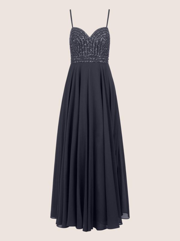 Dieses atemberaubende Abendkleid ist gemacht für unvergessliche Momente! Das Oberteil verführt im angesagten Bikini-Stil und ist allover mit funkelnden Pailletten und edlen Perlen bestickt – ein echtes Highlight! Der tiefe V-Ausschnitt am Rücken sorgt für einen Wow-Effekt, während die verstellbaren Spaghettiträger und eingearbeiteten Brustpads optimalen Halt bieten. Der weich fließende Chiffonrock schwingt traumhaft bei jedem Schritt und ist komplett mit Satin gefüttert – purer Luxus! Mit Reißverschluss in der hinteren Mitte und ca. 150 cm Länge ist dieses Kleid die perfekte Wahl für Gala, Ball oder Hochzeit.
