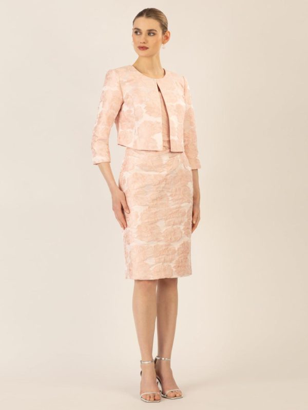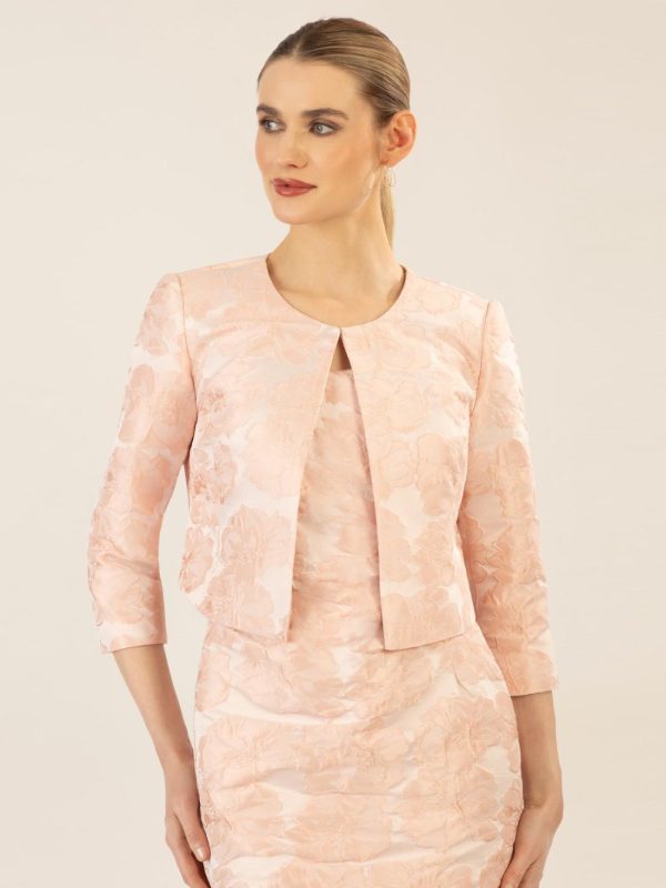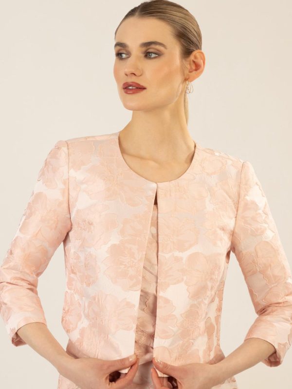 Elegantes Jacquard-Bolero mit feinem Blumenmuster. Die offene Vorderseite sorgt für einen modernen Look, während die leicht verkürzte Länge den Fokus auf die Taille legt. Ideal für besondere Anlässe oder als stilvolle Ergänzung zu Kleidern.