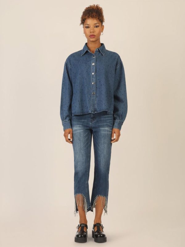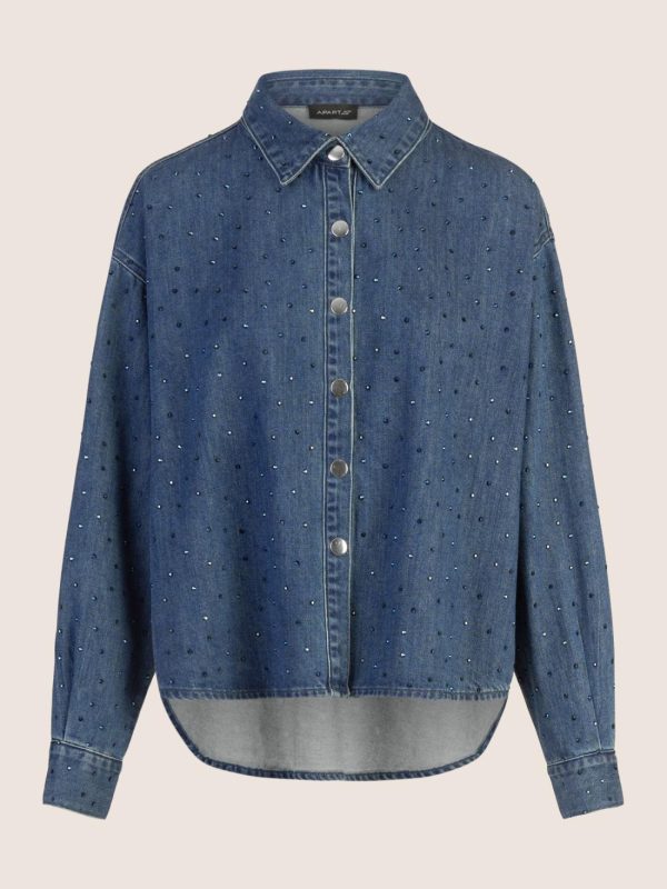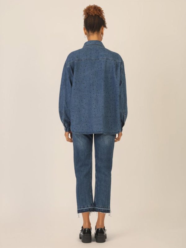 Dieses stark oversized geschnittene Jeanshemd ist ein echtes Highlight-Piece. Der leichte Used-Effekt trifft auf ein Allover-Design aus schwarzen Kristallsteinen, das dem klassischen Look einen edlen Twist verleiht. Überschnittene Schultern und extra weite Ärmel mit Manschetten unterstreichen die lässige, moderne Silhouette. Eine durchgehende Druckknopfleiste sowie silberfarbene Druckknöpfe an den Manschetten setzen authentische Denim-Akzente. Das Rückenteil ist mit einer typischen Passe gearbeitet. Jeans-typische Nähte runden das Design ab. Der Saum ist vorne und hinten abgerundet, hinten länger geschnitten. Länge: hinten ca. 74cm, vorne ca. 64cm.