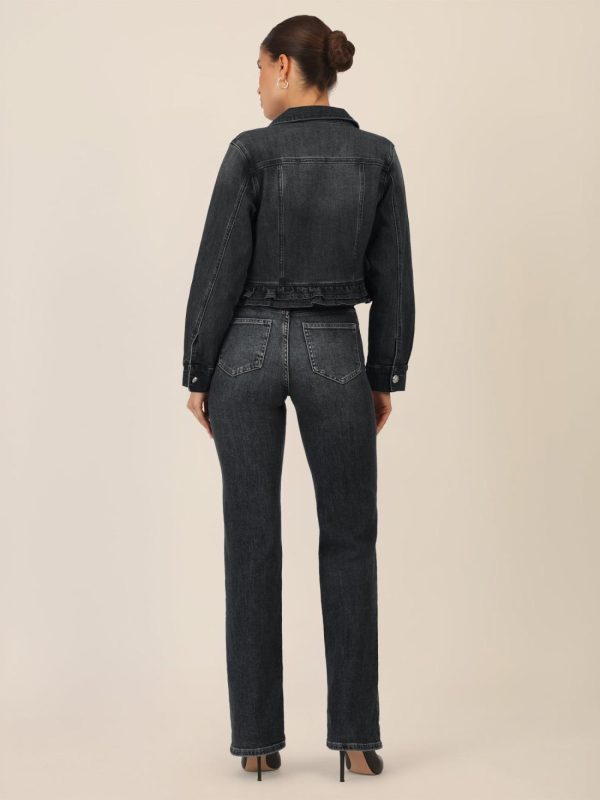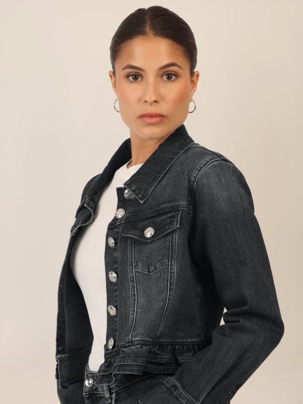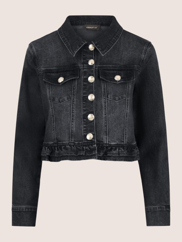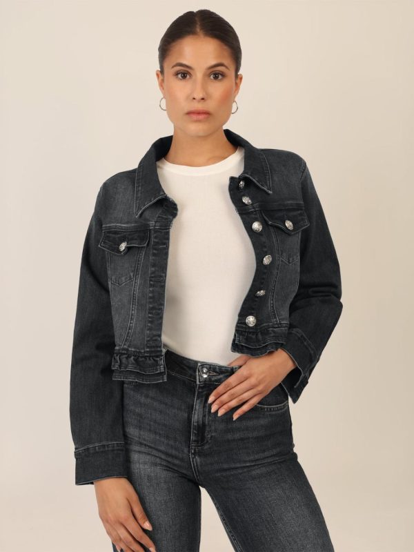 Diese verkürzte Jeansjacke interpretiert den Klassiker neu und setzt auf charmante Details. Die modisch verkürzte Schnittform sorgt für eine moderne, figurschmeichelnde Silhouette und lässt sich ideal zu Kleidern, Röcken oder High-Waist-Hosen kombinieren. Highlight ist der dekorative Rüschenbesatz am Saum, der dem Look eine verspielte Note verleiht und gekonnt mit dem robusten Denim kontrastiert. Metallknöpfe in Vintage-Optik zieren die Knopfleiste und Manschetten und runden das Design stilvoll ab. Eine Jacke, die jedem Outfit das gewisse Etwas verleiht – lässig, feminin, einzigartig.