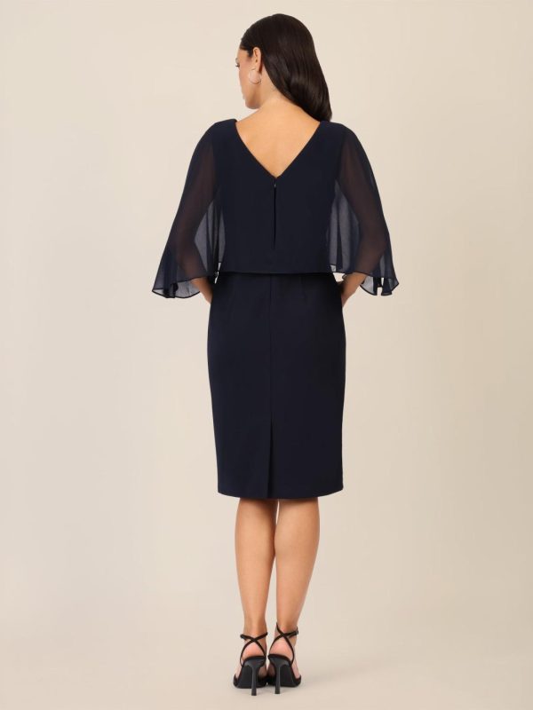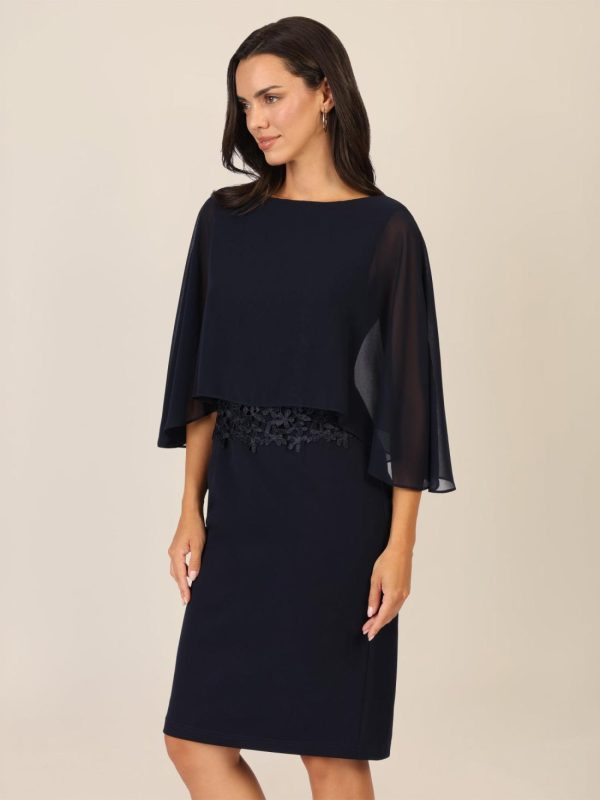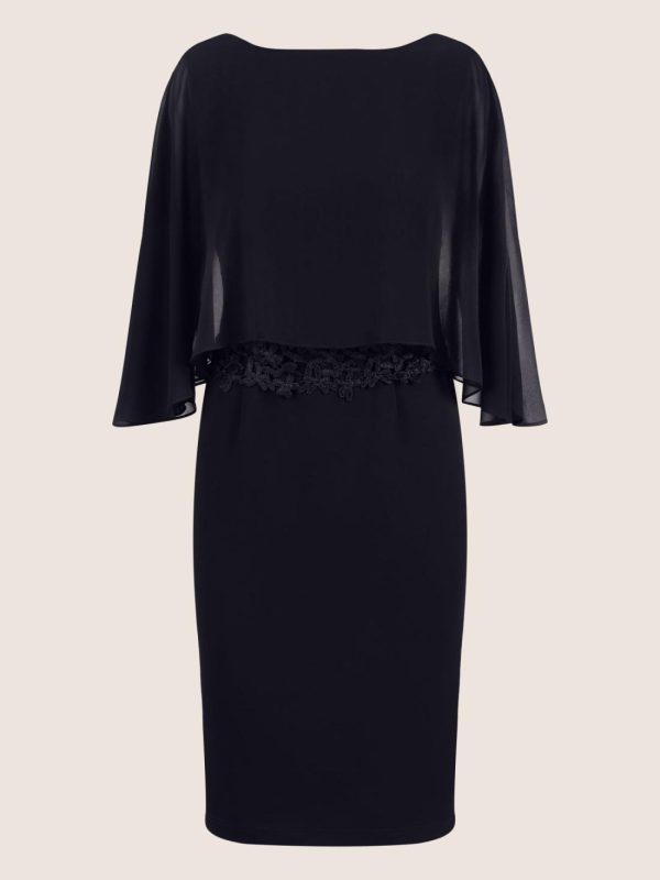 Dieses figurbetonte Kleid kombiniert raffinierte Materialien zu einem edlen Gesamtlook. Der Mix aus strukturierter Jerseyware, plastischer Spitze und fließendem Chiffon verleiht dem Design eine moderne Leichtigkeit. Vorne zeigt sich das Kleid mit einem klassischen Rundhalsausschnitt, hinten mit einem femininen V-Ausschnitt. Das fest fixierte Chiffoncape fällt gerade über Schultern und Rücken und öffnet sich stilvoll durch einen Schlitz in der hinteren Mitte. Das Oberteil aus filigraner Spitze sowie formgebende Abnäher unterstreichen die Silhouette gekonnt. Ein Reißverschluss und ein Gehschlitz hinten sorgen für komfortables Tragen und Bewegungsfreiheit. Komplett gefüttert bietet dieses Modell besten Tragekomfort – ideal für elegante Events und besondere Anlässe.