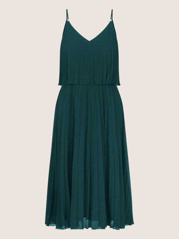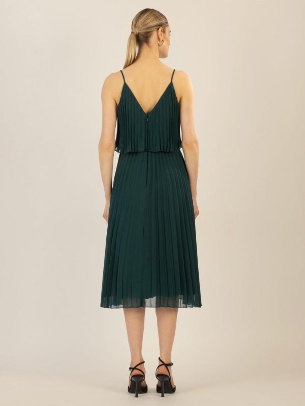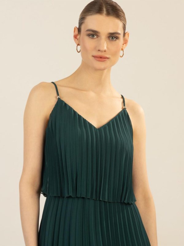 Feminines Plisseekleid mit schmalen Spaghettiträgern und leichtem V-Ausschnitt. Das plissierte Design sorgt für eine luftige, fließende Silhouette, während das locker fallende Oberteil zusätzlichen Komfort und Eleganz bietet. Ideal für vielseitige Anlässe.