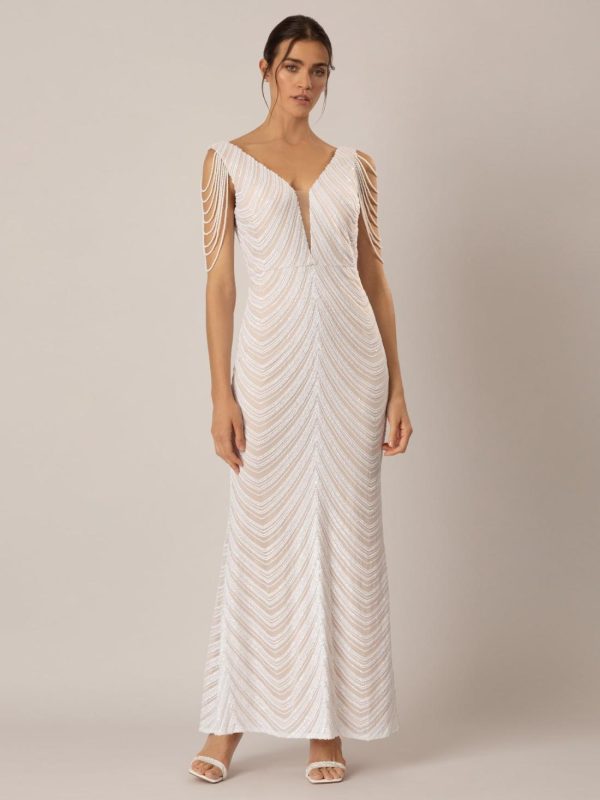 Das APART Hochzeitskleid ist ein elegantes und edles Kleidungsstück, das perfekt für den besonderen Tag geeignet ist. Der breite Ausschnitt mit tiefen V-Ausschnitten verleiht dem Kleid eine feminine Note, während der nudefarbene Mesh-Einsatz vorne für einen Hauch von Eleganz sorgt. Die Armlöcher sind mit mehrlagigen Ketten verziert, was dem Kleid einen modernen und glamourösen Look verleiht. Eingearbeitete Bustpads sorgen für eine perfekte Passform und die Tailennaht betont die Figur auf vorteilhafte Weise. Insgesamt strahlt das APART Hochzeitskleid eine formale und ermutigende Tonart aus, die jede Braut strahlen lässt: