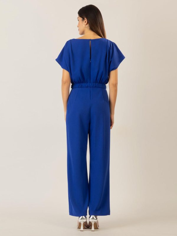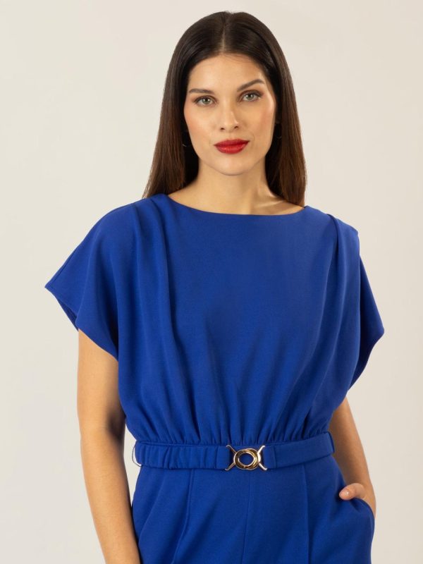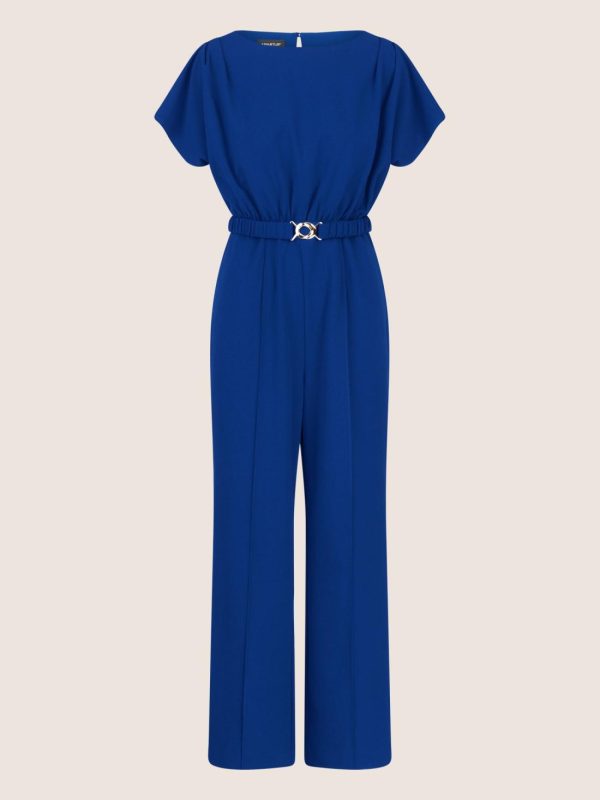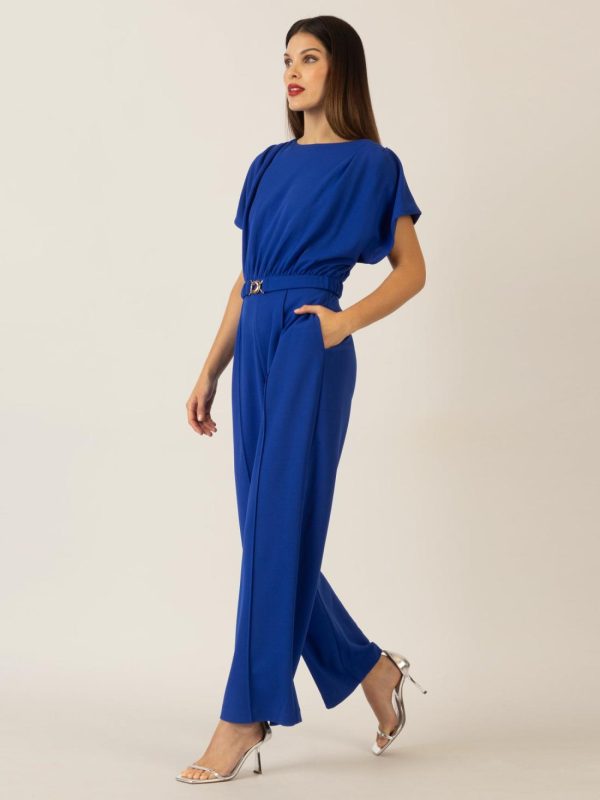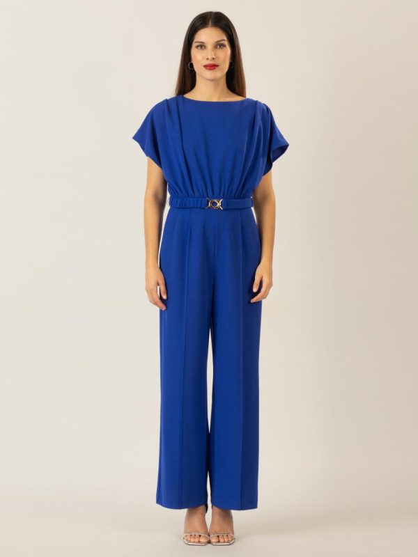 Ein stilvoller Overall mit einem eleganten Rundhalsausschnitt und kurzen, locker fallenden Ärmeln. Die Taille wird durch einen elastischen Gürtel mit goldfarbenem Detail akzentuiert, der dem Look Struktur verleiht. Das weit geschnittene Bein sorgt für eine schmeichelnde Silhouette und angenehmen Tragekomfort. Ein perfektes Kleidungsstück für einen modernen und zugleich entspannten Auftritt.