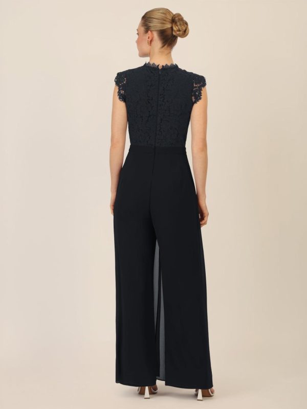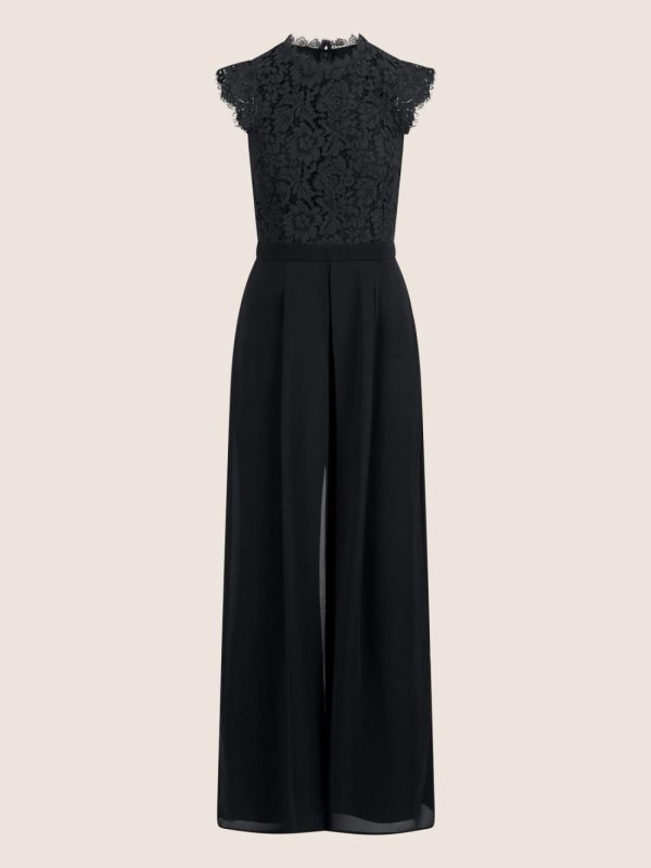 Ein Statement-Piece für besondere Anlässe: Dieser elegante Overall kombiniert ein detailverliebtes Spitzenoberteil mit einer fließenden, weit geschnittenen Hose. Der runde Ausschnitt wird durch einen zarten Spitzenstehkragen stilvoll betont. Kleine Spitzen-Caps an den Armlöchern verleihen dem Look einen femininen Touch. Die strukturierte Hosenpartie mit Bundfalten und Chiffon-Layer sorgt für edle Leichtigkeit, während ein vertiefter Schritt und weite Beine moderne Eleganz ausstrahlen. Praktisch und schick zugleich mit seitlichen Eingrifftaschen und Reißverschluss im Rücken. Seitenlänge ab Taille: ca. 108 cm.
