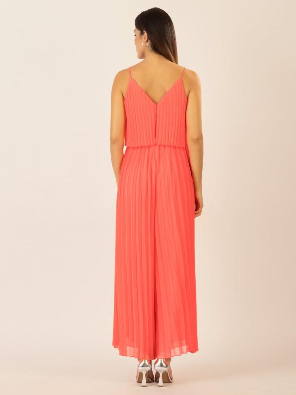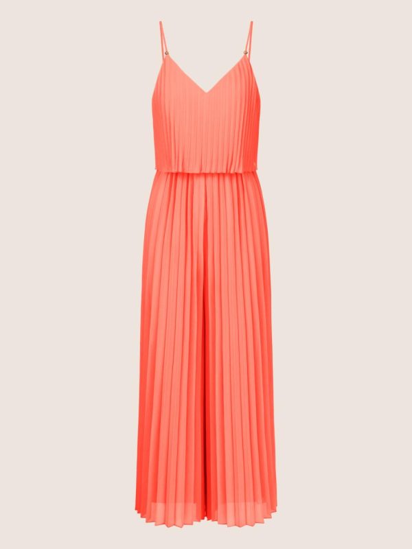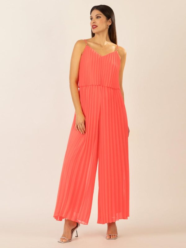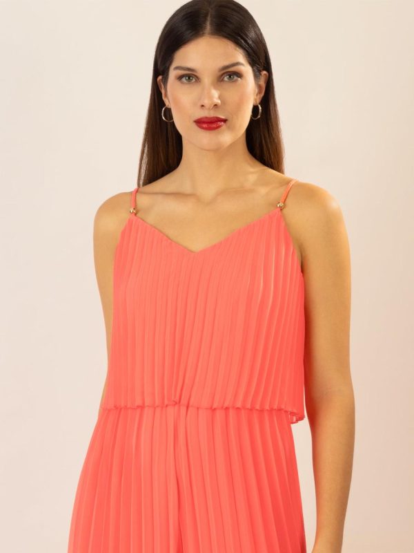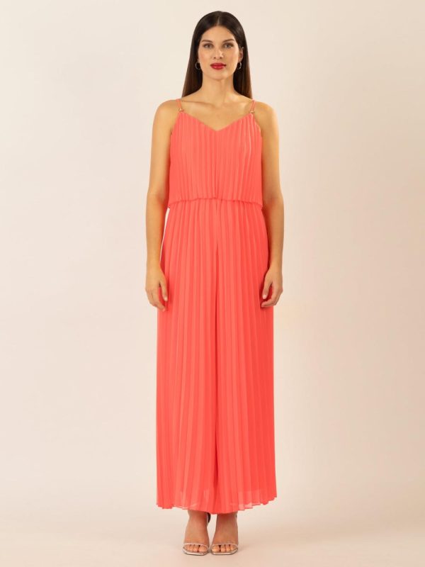 Eleganter Plissee-Overall mit schmalen Spaghettiträgern und V-Ausschnitt. Das locker fallende Oberteil und die plissierte Hose sorgen für eine luftige Silhouette, während das Design eine moderne und zugleich feminine Optik bietet.