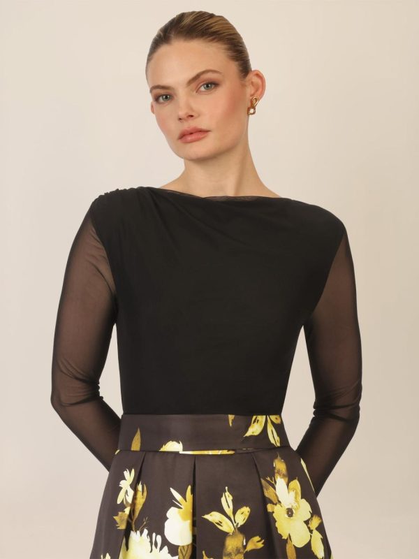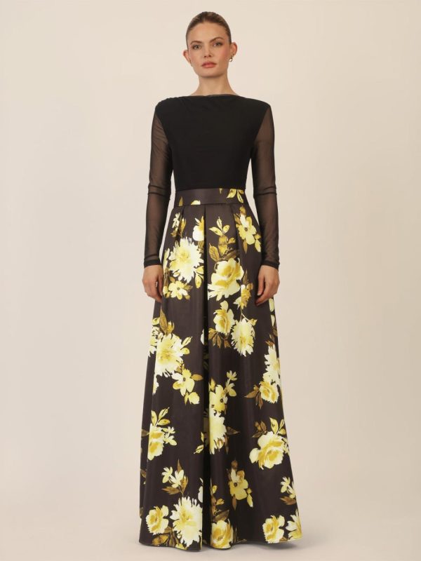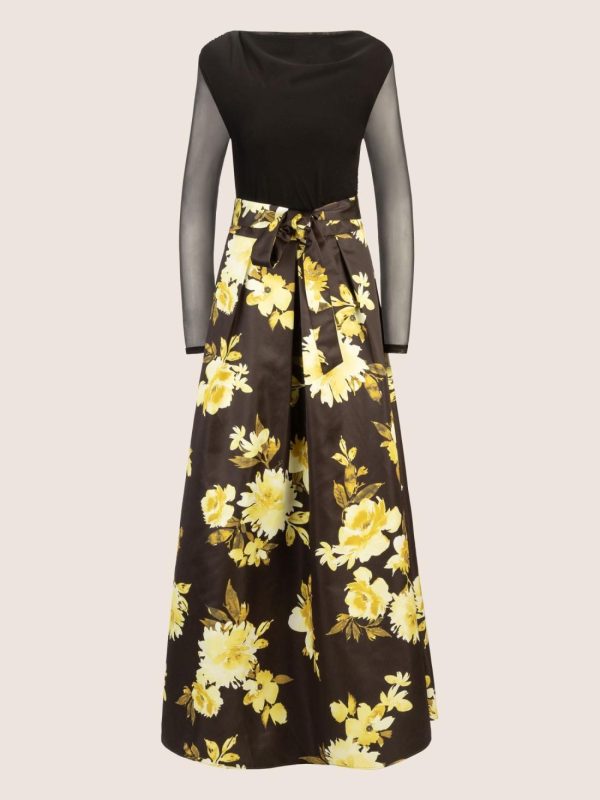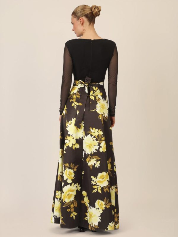 Dieses lange Abendkleid vereint weichen Mesh mit mattschimmerndem Satin und zeigt sich allover in einem kunstvollen Blumenmuster. Der gerade, U-Boot ähnliche Ausschnitt vorn und hinten verleiht dem Look klassische Eleganz, während feine Raffungen an der linken Schulter und der rechten Seitennaht raffinierte Akzente setzen. Der Bodypart ist mit blickdichtem Jersey unterlegt und sorgt für angenehmen Tragekomfort. Lange, schmale Ärmel und ein definierter Taillenbund betonen die feminine Silhouette. Der ausgestellte Rock mit eingelegten Falten im Vorderteil und Taillenabnähern im Rücken unterstreicht die fließende Bewegung. Praktische Details wie seitliche Eingriffstaschen und ein separater Bindegürtel ergänzen das Design. Ein knielanges Futter im Rock und der rückseitige Reißverschluss komplettieren das Kleid. Ein Look voller Poesie und Stil – ideal für Galas, Hochzeiten oder besondere Abendveranstaltungen.