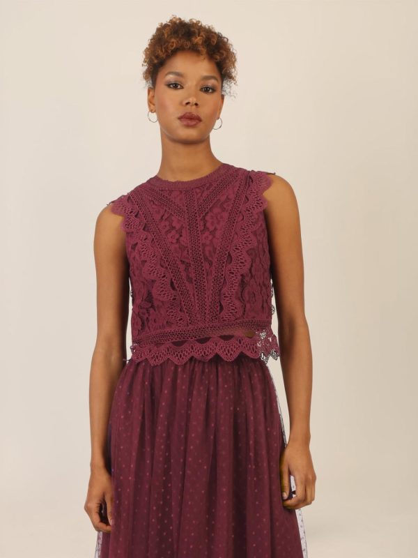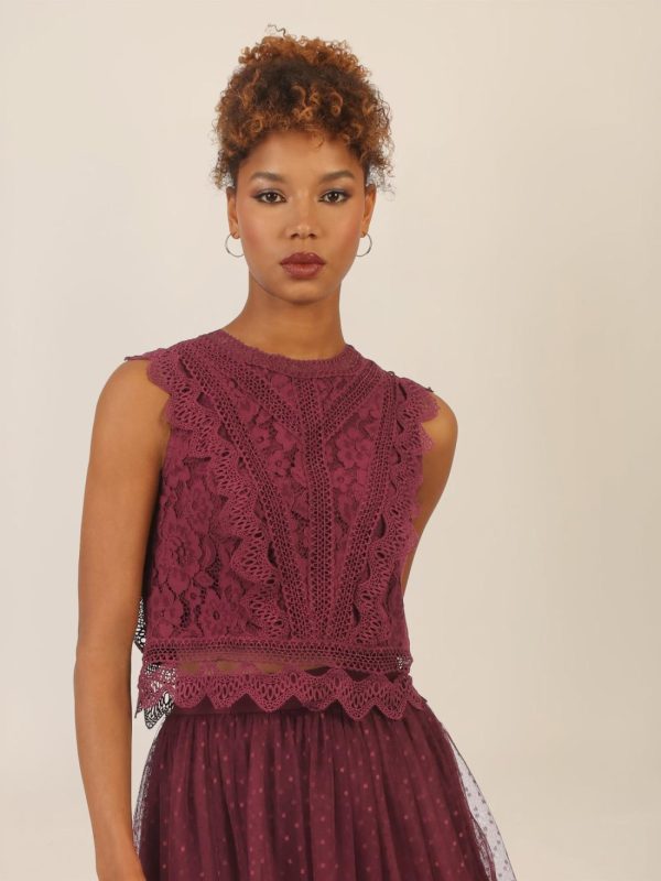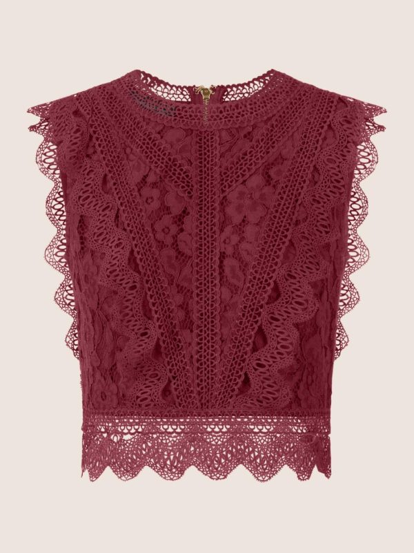 Ein traumhaftes Top aus plastischer Spitze, das mit verspielten Spitzenbändern zusätzlich veredelt wurde. Der runde Ausschnitt vorn und hinten wird von einer zarten Lochspitzenblende eingerahmt. Raffinierte Teilungsnähte sorgen für eine feminine Silhouette und sind mit dekorativem Spitzenband samt Bogenkante akzentuiert. Der breite, semitransparente Saumabschluss mit Bogenkante verleiht dem Look Leichtigkeit. Highlight: ein sichtbarer, goldfarbener Reißverschluss in der hinteren Mitte. Vollständig gefüttert für höchsten Tragekomfort. Länge: ca. 52 cm.