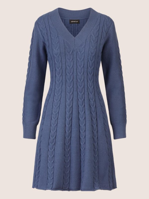 Strickkleid Mit Zopfmuster Und V-Ausschnitt Mittelblau | DAMEN APART Fashion KLEIDER