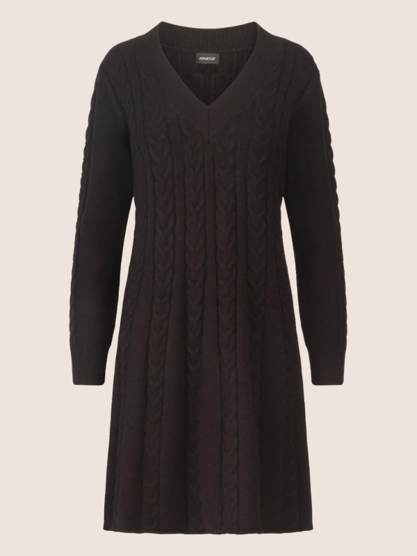 Dieses kurze Strickkleid begeistert mit seinem charmanten Zopfmuster und einer hochwertigen Viskose-Kaschmir-Mischung, die wunderbar weich auf der Haut liegt. Der tiefe V-Ausschnitt mit breiter Rippenblende sorgt für einen modernen Look, während die langen Ärmel mit breitem Bündchen Gemütlichkeit versprechen. Die leicht taillierte Silhouette und der ausgestellte Rockpart verleihen dem Kleid eine verspielte, feminine Bewegung – perfekt für stilvolle Auftritte im Alltag oder zu besonderen Anlässen. Länge: ca. 94 cm.